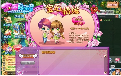 《宝石总动员》将宝石世界与真爱完美融合,情侣系统的推出掀起了一场恋爱风暴,全方位的为你营造与梦中情人邂逅的机会。玩家结为情侣后,玩家们便可以在甜蜜的爱河中徜徉,体验出双入对并肩作战的乐趣。情侣在一起游戏或互赠礼物的同时还会提升情侣亲密度,亲密度的提高不仅可以让情侣关系更加密切,也为爱情留下了永恒的见证。