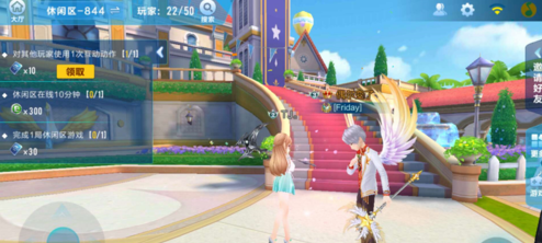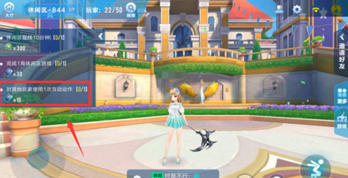 如图,在左上角列表中有一项任务是要求与其他玩家互动一次,完成任务可获得10个点券。