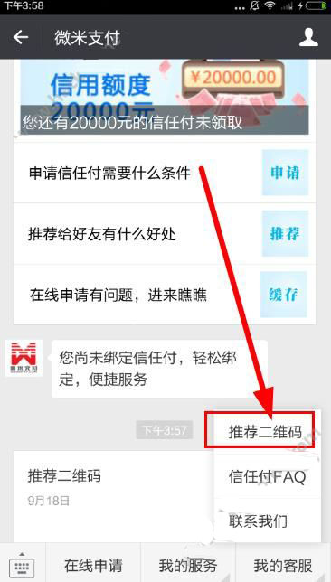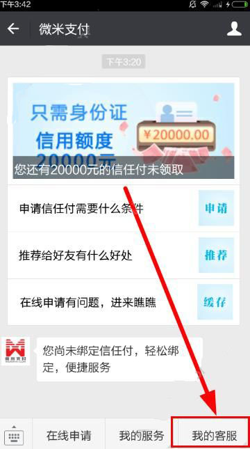首先大家在微米信任付微信公众号的首页,点击右下角“我的客服”按钮;