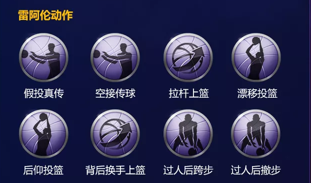 雷阿伦的有假投真传、空接传球、拉杆上篮、漂移投篮、后仰投篮、背后换手上篮、过人后跨步、过人后撤步。