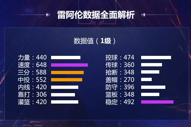 在游戏中雷阿伦的初始数值速度648、三分588、中投552、稳定492。雷阿伦在游戏中将成为最强得分利器,是球队撕开防守的利剑,强大的投射能力让对手不得不小心翼翼的防守。