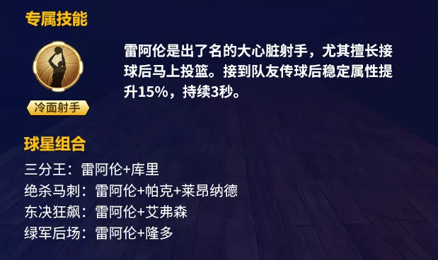 雷阿伦的专属技能是“冷面射手”,雷阿伦是出了名的大心脏射手,尤其擅长接球后马上投篮。接到队友传球后稳定属性提升15%,持续3秒。