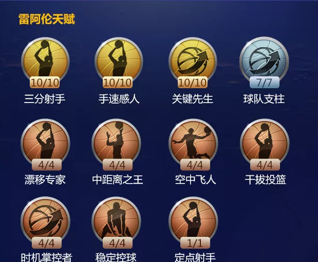 雷阿伦的天赋技能10级的有三分射手、手速感人和关键先生,7级的有球队支柱,4级的技能有漂移专家,中距离之王、空中飞人、干拔投篮、时机掌控者、稳定控球和1级的定点射手技能。
