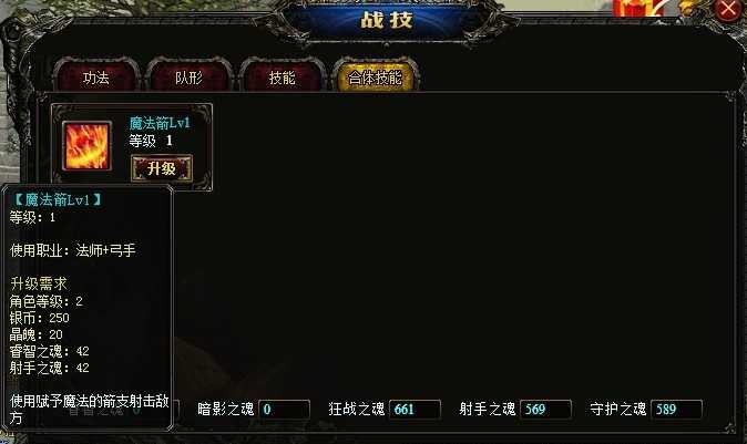 以魔法箭为例,每次触发合体技之后,会获得睿智之魂和射手之魂,但必须是玩家招募的英雄触发合体技才能,玩家自己选择的职业触发合体技则不会进行经验的叠加。当合体技发动一定次数,满足升级条件时,可以通过战技面板手动为合体技进行升级。