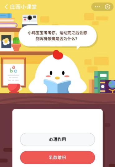支付宝庄园小课堂11月28日的问题是,小鸡宝宝考考你,运动完之后会感到浑身酸痛是因为什么?到底是心理作用还是乳酸堆积呢?看看下文正确答案。