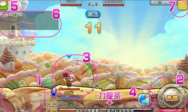 2.“开炮":控制炮弹发射的力度,按住“开炮”的时间越久,炮弹发射的距离越远。最下面的“力度条”,会显示当前攻击操作所产生的力度。