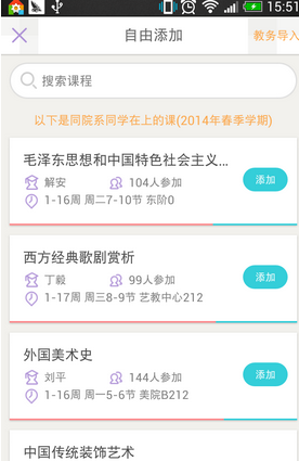 3、成功登录账号以后,我们所需要学会的第一步就是添加课程,课程格子支持教务导入、复制课表与自由添加三种方式导入课表。我们只需点击课表下方的的添课图标,就可以成功导入;