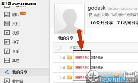 3、在这里你可以查看自己的分享是否通过了百度的审核。也就是说生成分享链接并不意味着分享成功,只有通过审核才行。如果显示“审核失败”,即使你的链接发给了朋友,他自然无法访问。