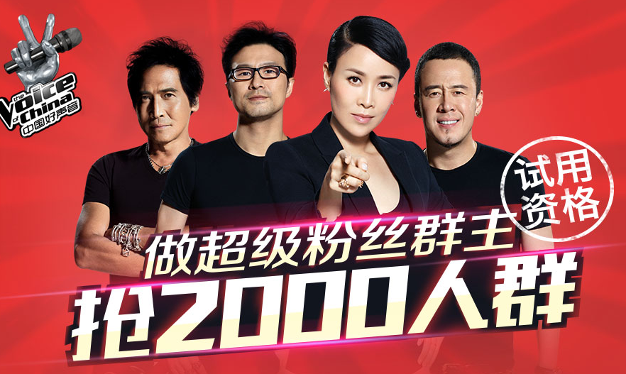 2000人群中国好声音活动,为自己喜爱的学员加油打气并分享至QQ空间或迎来好友的支持即可获得2000人群,让你做超级粉丝群主,活动时间有限,小伙伴们赶紧来参与挑战吧!