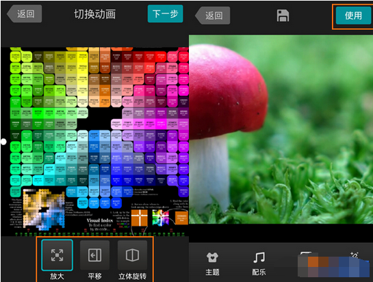 3、8张图片放进去后,可以设置视频的切换动画效果,分别是“放大”、“平移”、“立体旋转”。满意后点击“使用”。