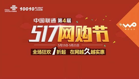 中国正式宣布将于5月15日至5月21日在世界电信日之际举办“第四届5·17网购节”。本届网购节最大的亮点是回馈老用户,在网越久的老用户享受越多的优惠,主要的优惠有10元可购买1G全国流量包;指定中高端机型仅需99元。本届网购节以中国联通手机营业厅客户端为主平台。