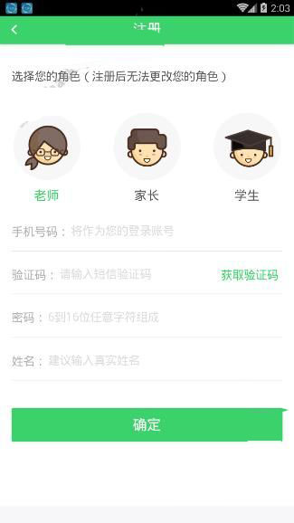 2、然后选择对应的身份,有三种身份可选择,分别是老师、家长、学生,不同身份的选择APP对应的功能会有所不同哦,用户们根据自己的实际需求去选择对应身份。