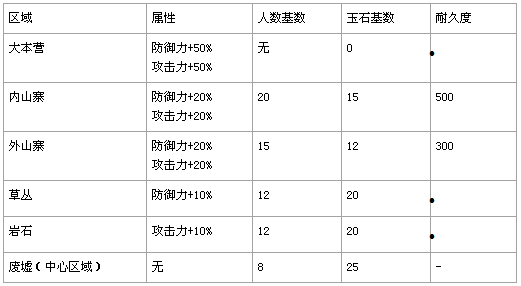 山寨对应的“耐久度”,被敌对势力攻击时,耐久度减少,当耐久度变为0时,山寨被摧毁,另外两个山寨将获得玉石奖励。