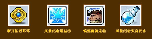 新开拓这耳环、风暴纪念增益券、蝙蝠魔骑宠券、风暴纪念变身药水