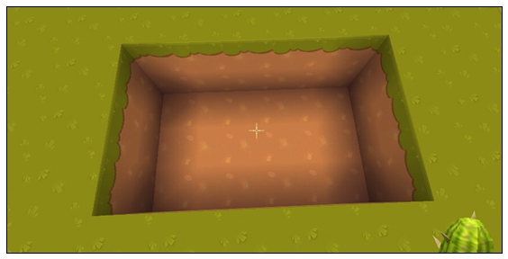 1.首先先在地面挖一个深2格的坑,长宽多少看大家开心了,爱多大挖多大,越大效果越好;