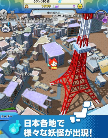 玩家可以在日本各地借助GPS搜索妖怪们的位置然后进行。在遇到怪物的时候,还能组织队伍进行战斗。截图中我们可以看到,游戏对整个日本地图进行了模型制作,不少地标型建筑物都被标注出来。为了庆祝游戏上线,官方还将与谷歌地图展开两周的合作,玩家可以直接在谷歌地图中进行怪物导航。不止能进行收集打怪的玩法,还能充分的看到日本全景地图,导航在各地出现的妖怪;