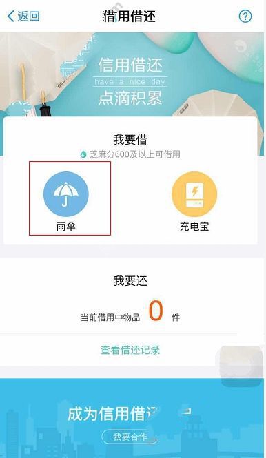 第四步:进入信用借还后,如您的芝麻分在600及以上就可以借用哦,包含借伞以及充电宝的服务,是不是觉得很贴心呢,不过借了之后要记得归还哦。