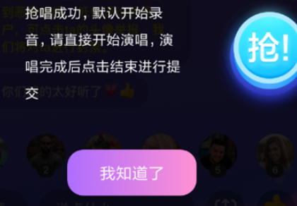 3、通过右侧的按钮就可以进行抢唱,录音唱完之后会自动上传你的音频文件,由系统判断是否合格,倘若失败就会扣除左上角的爱心哦!