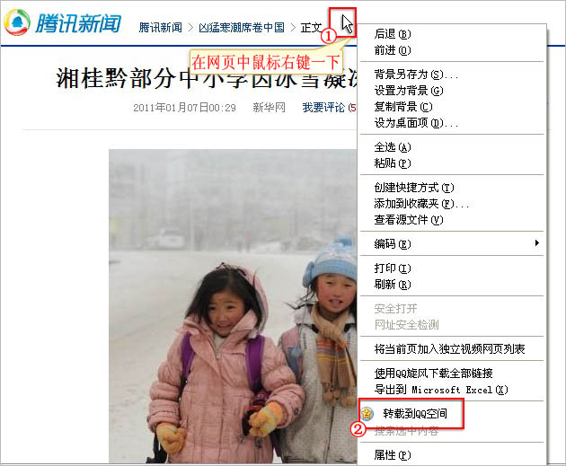 打开一个网页(网页中需要登录QQ号码),在网页中用鼠标右键点击一下,然后在选项中选择“转载到QQ空间”;如图: