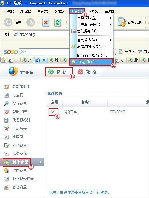 2、若您使用的是TT浏览器,需要您手动设置一下:打开任意一个网页,点击上方“工具”=》“TT选项”=》“插件管理”中将QQ工具栏方框里的勾打上=》“保存”。如图: