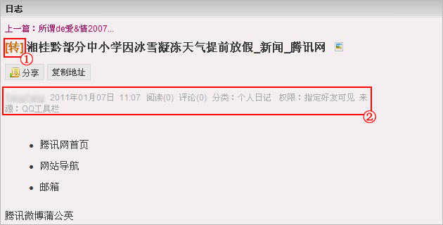 当您点击“转载到我的空间”之后,会直接进入您空间的该篇日志,日标题会显示“转”字(不能去除),另外会显示发日志的时间等,来源这里会显示“QQ工具栏”。如图: