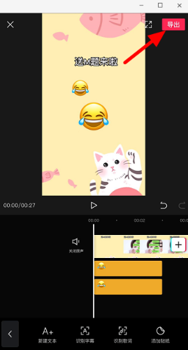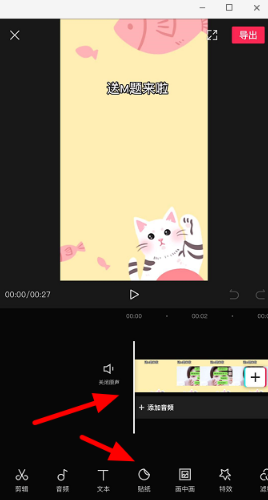 将时间轴拉到想要添加表情的位置,然后点击“贴纸”。