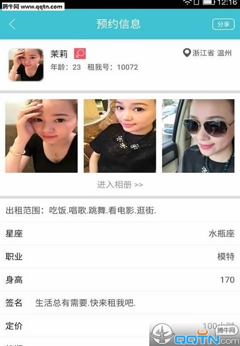 租我app是国内首款可以出租自己的软件。通过这款软件,可以快捷的出租自己佣金,随时随地都可以查看自己的订单以及预约信息,完全实名认证。用户随时都可以租一个男朋友或是女朋友,陪自己逛街、吃饭、看电影等,还能租厨师、家政人员等,很方便,绝对可靠,绝对值得您信赖。