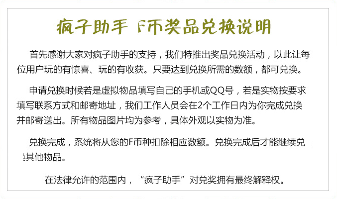F币是疯子助手中的一种虚拟货币,您可以在"兑奖专区"中,兑换您想要的奖品。详情请看兑奖专区。