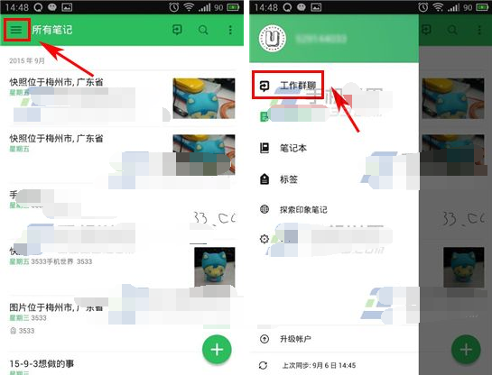 1)打开印象笔记点击左上角【三】,接着点击【工作群聊】。(如下图)