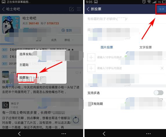 2)点击【投票贴】类型,接着编辑投票贴内容后点击右上角【发表】即可。(如下图)
