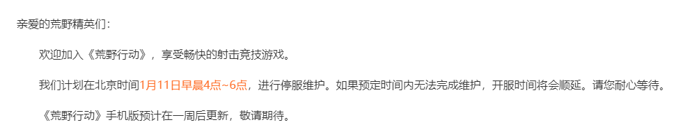 荒野行动PC版1月11日服务器开服时间: