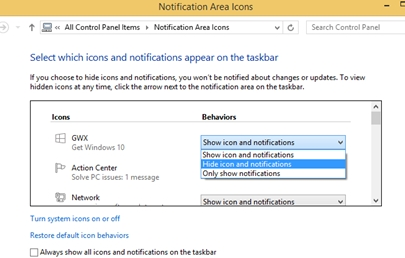 3、在通知区图标窗口中,针对GWX图标选择隐藏图标和通知。