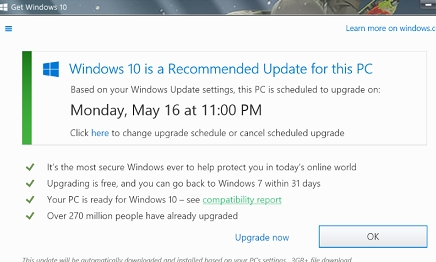 这显然是个大坑,如果你不点击立即升级,而是点击OK或者关闭按钮,就会在微软设定的时间直接升级Windows 10,不会再有任何提示,结果就是很上次使用还是Windows 7,再开机就变Windows 10了。
