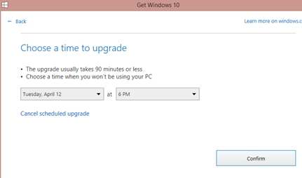 现在,最新版的Get Windows 10(GWX)升级应用中,微软提供了一次额外确认已安排升级时间的选项,相当于给了一粒后悔药。