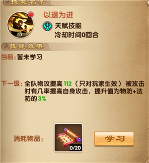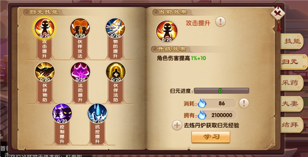 学习归元技能,可以增强主角和伙伴的攻击,和控制等属性