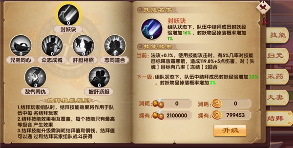 结拜后可以获得的技能,增加一些玩法的产出和经验获得,以及的属性加成