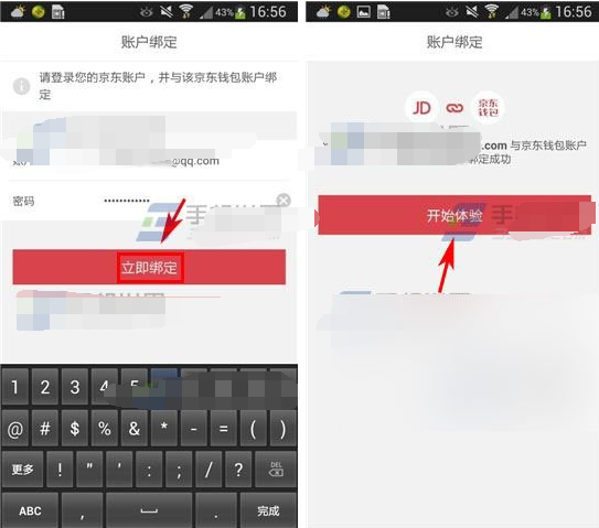 2)在账户绑定页面上输入【京东账户名】和密码点击【立即绑定】,然后在点击【立即体验】即可完成。(如下图)
