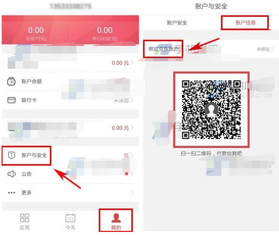1)首先打开京东钱包进入首页点击右下角【我的】页面上的【账户与安全】,进入后点击账户信息上的【绑定京东账户】进入下一步;(如下图)