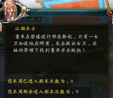 2、副本入口位于王城NPC术士(729 561),在该NPC处可查询本周剩余副本进入次数,每周9次,可进入6次。