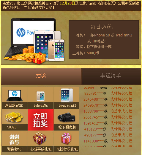 2.新玩家进入《御龙在天》12月20日及之后开启的公测新区,创建即可于游戏内100%免费获得“钻”(会员、蓝钻、黄钻等,30天)一个,100%免费获得最少5Q币,以及()一注!