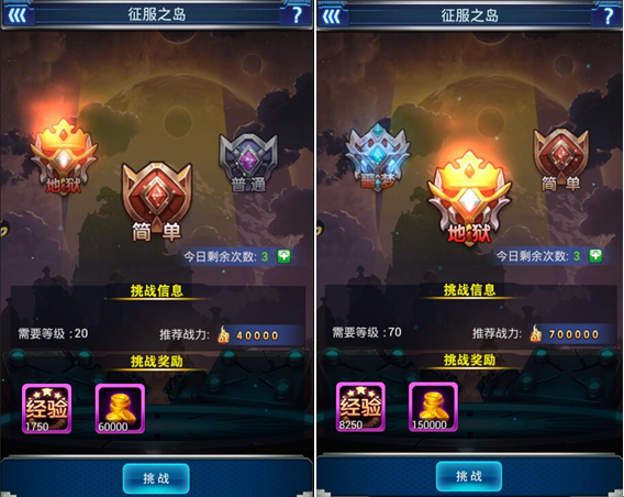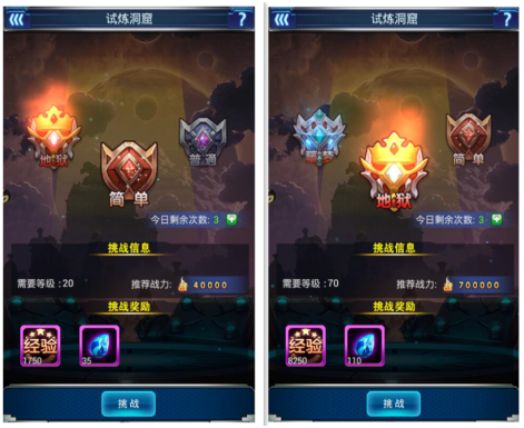 挑战难度:分为简单、普通、困难、英雄、噩梦、地狱这六个不同难度的关卡。