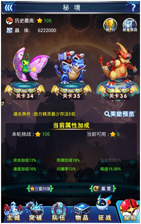 挑战规则:训练师到达25级开启此副本。每关有三种难度可选,为简单、普通、困难。分别对应一星、两星、三星的奖励。三关为一轮。一轮结束后,可根据累计所得的星星数量,领取不同等级的奖励,以及选择不同的属性加成。