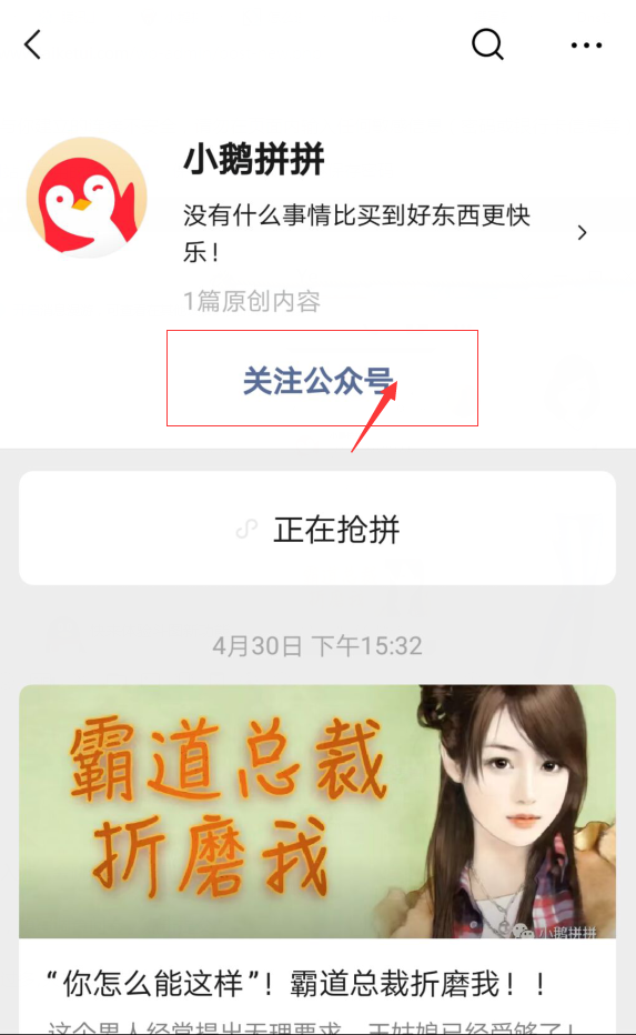第一步:微信搜索“小鹅拼拼”公众号,点击关注。
