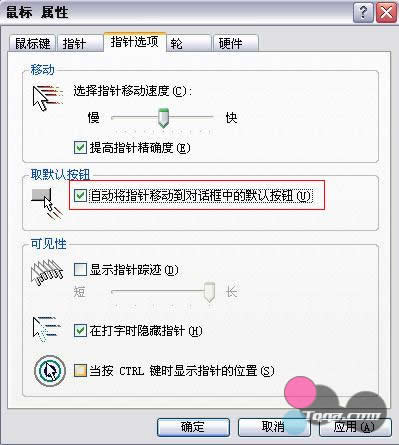 首先在“控制面板”中打开“鼠标”设置,打开“指针选项”选项卡,勾选“自动将指针移动到对话框中的默认按钮”选项,“确定”退出。