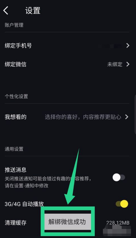 点击已绑定就是解绑微信的操作,能看到底部的提示,解绑微信成功。如图