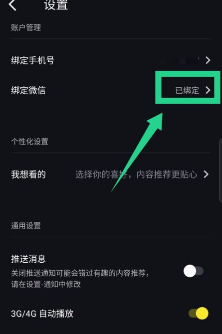 然后在打开的设置里面,能看到绑定的微信,不过绑定手机号才可以解绑微信,可以先绑定手机。如图