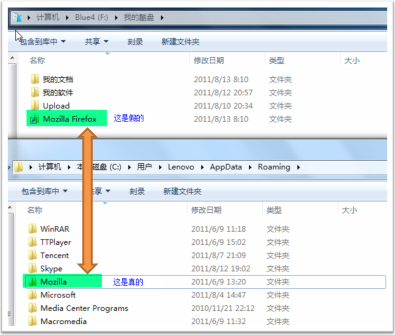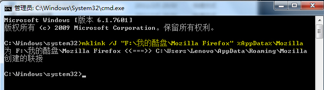 mklink /J "F:\我的酷盘\Mozilla Firefox" %AppData%\Mozilla