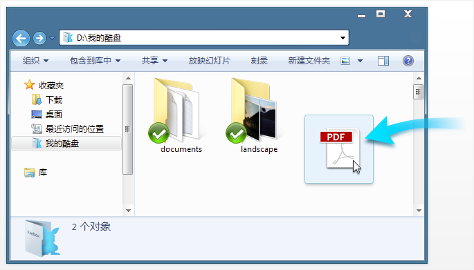 在电脑中安装酷盘客户端,将照片、文档、音乐放入到“我的酷盘”文件夹,即可在您的每台电脑、手机以及酷盘网站上随时访问。使用酷盘后,您会发现跨平台的管理个人资料是如此的方便快捷!