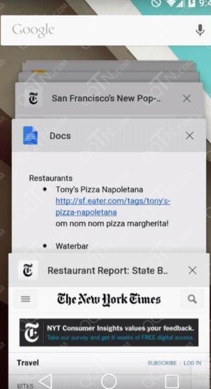 多任务视窗现在有了一个新的名字,Overview(概览)。在界面中,每一个app都是一张独立的卡片,拥有立体式的层叠效果,用户可以设定“最近应用程序”,通过滑动来快速切换app。最值得称道的一点是,像一个多叉树那样,在每一个app目录之下还能继续创建多重卡片。比如说用户正在邮箱中编写邮件,可以通过在Overiew中切换卡片,返回到原来的收件箱界面,真正实现了在同一app中随心切换操作。