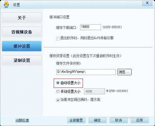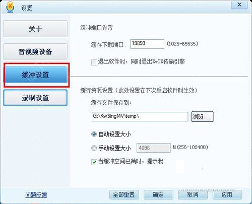6.在缓冲设置对话框中,我们可以看到在右边的选项设置中,包括缓冲端口设置,缓冲资源位置设置,我们在缓冲资源位置设置中,看到所设置的文件夹位置,等下我们要找的视频就在这个位置。我们也可以更改这个位置。